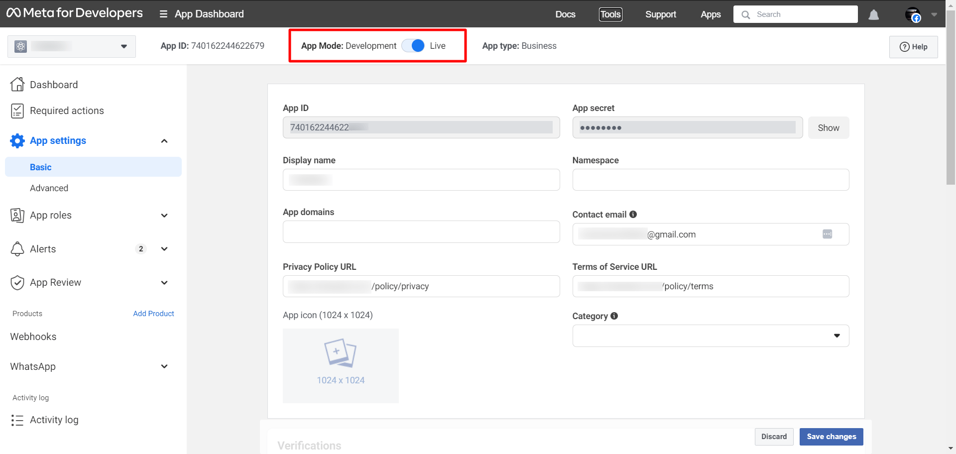 Then from the App settings, click on the Basic option and add the Privacy Policy URL and Terms of Service URL from the SuiteFunnel. These URLs are available on the Connect bot page of SuiteFunnel. After adding these URLs just click on the “Save changes” button.